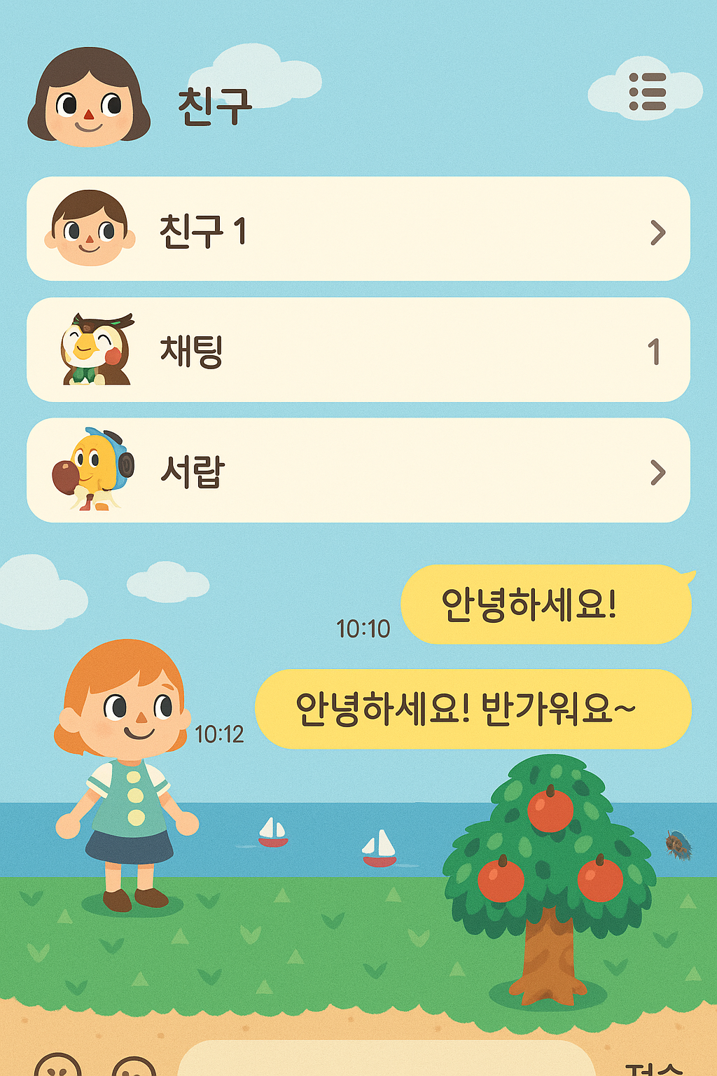 채팅창 말풍선도 일반적인 회색이나 파란색에서 벗어나, 나무 패턴이나 마을 이웃들이 대화하는 것 같은 연출로 감성을 자극해요. 폰트도 부드럽고 둥근 스타일로 적용되어, 전반적으로 눈에 피로도가 적고 편안한 느낌이에요.