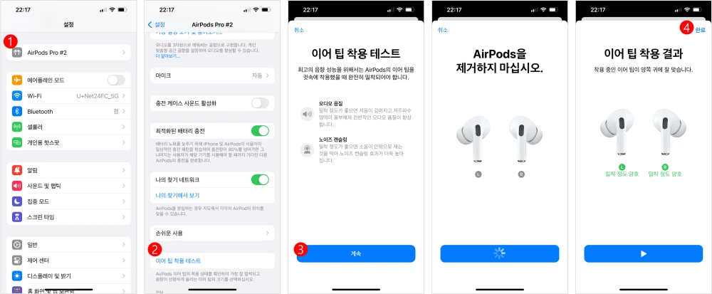 이어팁 테스트 설정 > 블루투스 > 에어팟 정보 귀에 맞는 착용감 및 밀착도 확인